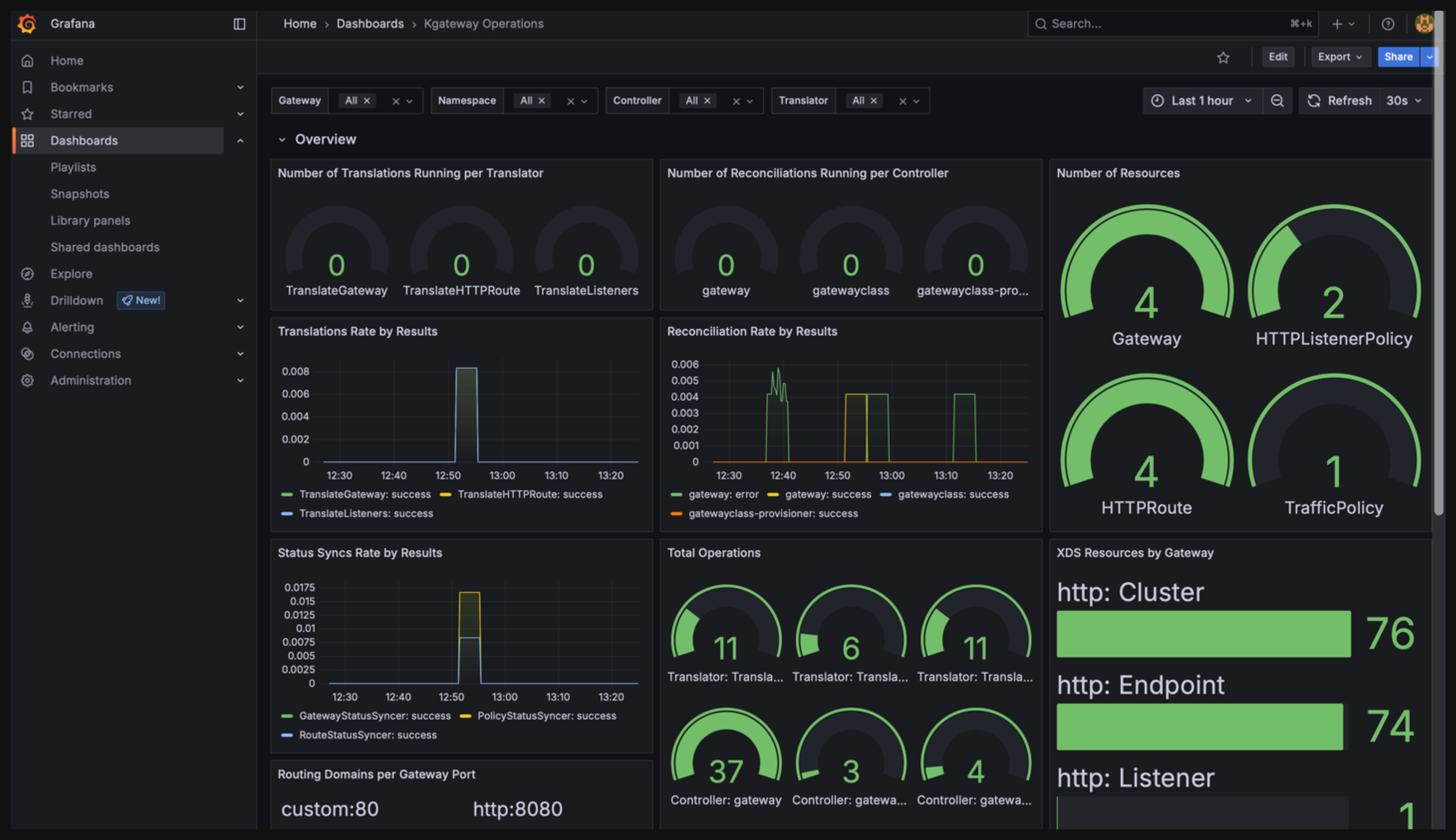 When you install the OTel stack, you can now leverage the new kgateway operations dashboard for Grafana. This dashboard shows important metrics at a glance, such as the translation and reconciliation time, total number of operations, the number of resources in your cluster, and latency.