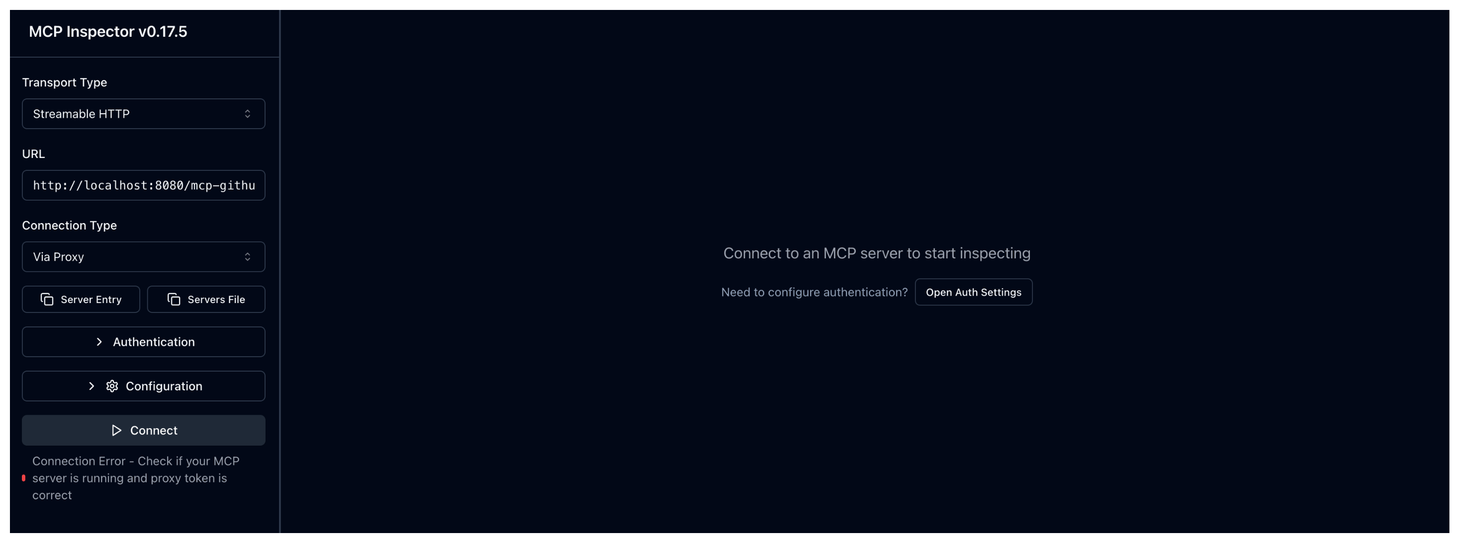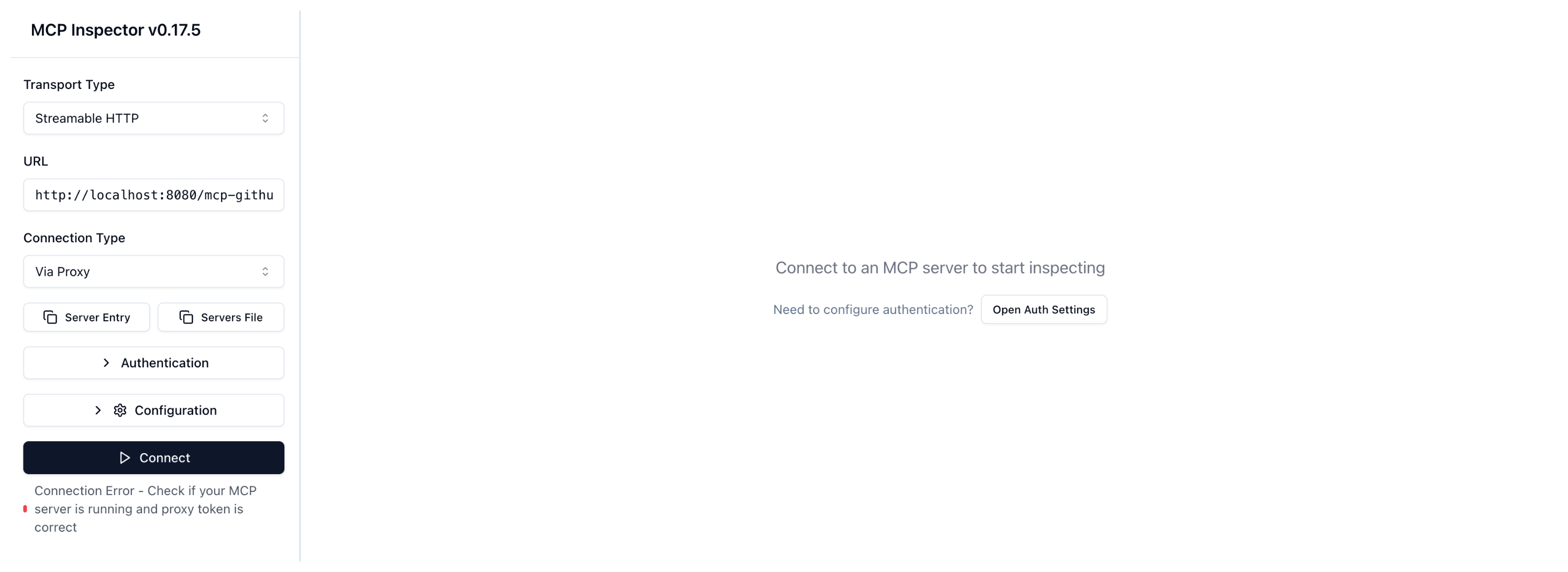 Connection Error - Check if your MCP server is running and proxy token is correct