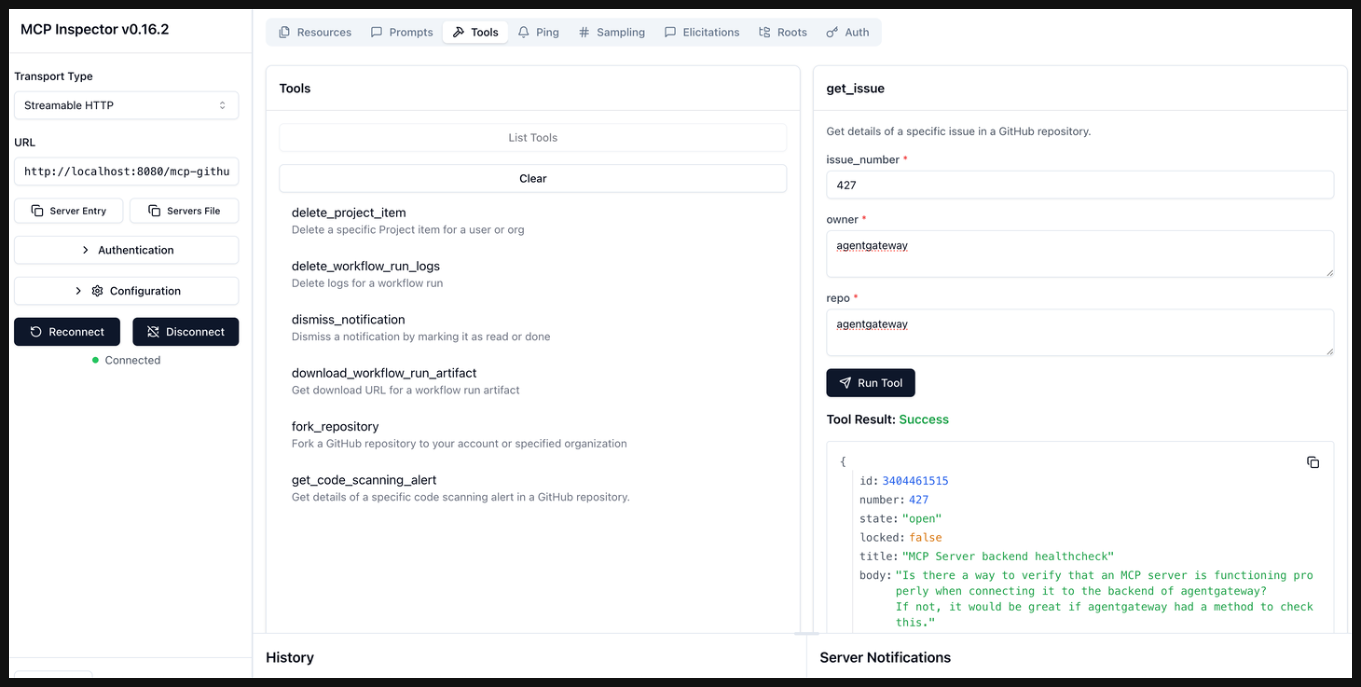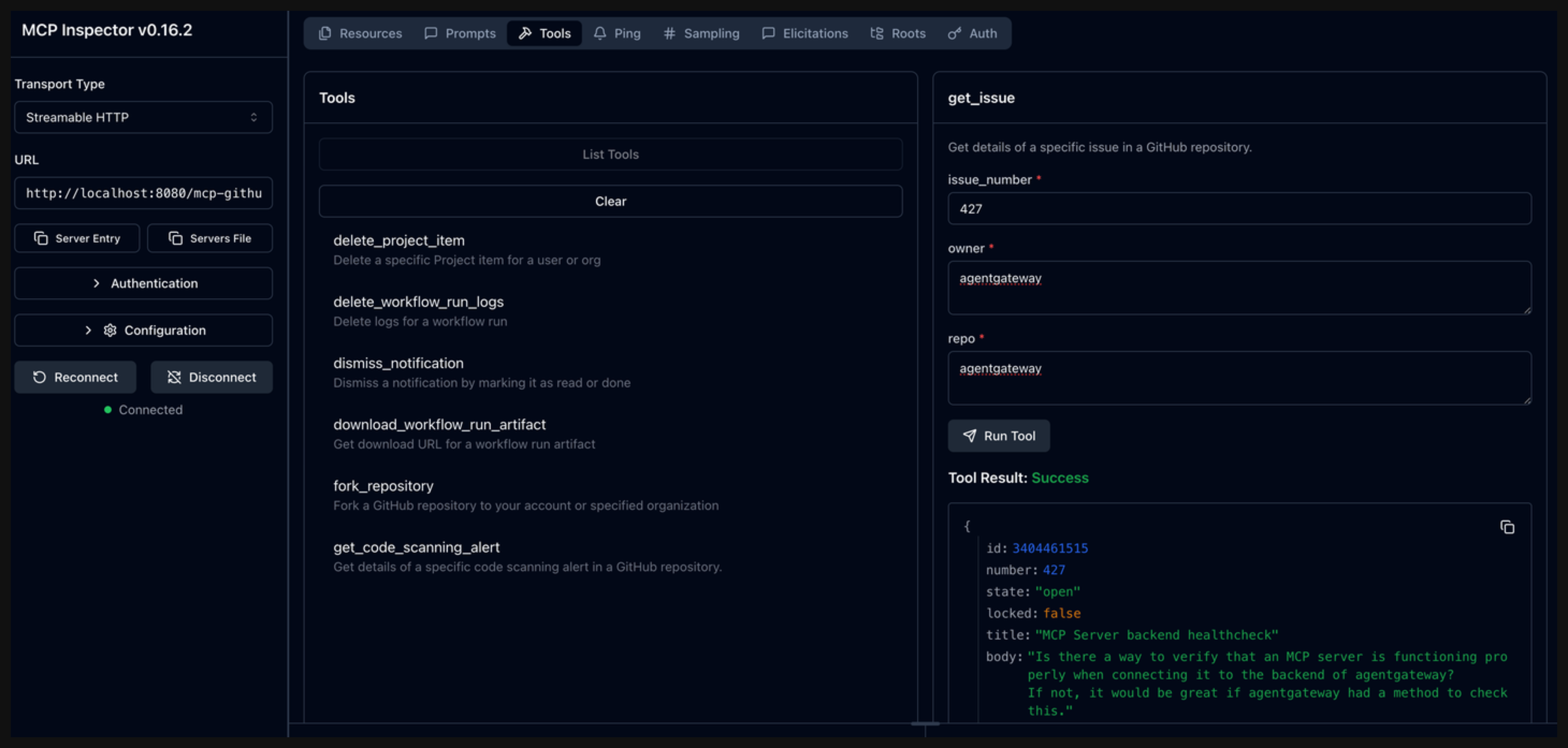 field to 443.kubectl apply -f- <<EOF apiVersion: gateway.kgateway.dev/v1alpha1 kind: Backend metadata: name: github-mcp-backend namespace: kgateway-system spec: type: MCP mcp: targets: - name: mcp-target static: host: api.githubcopilot.com port: 443 path: /mcp/ EOF